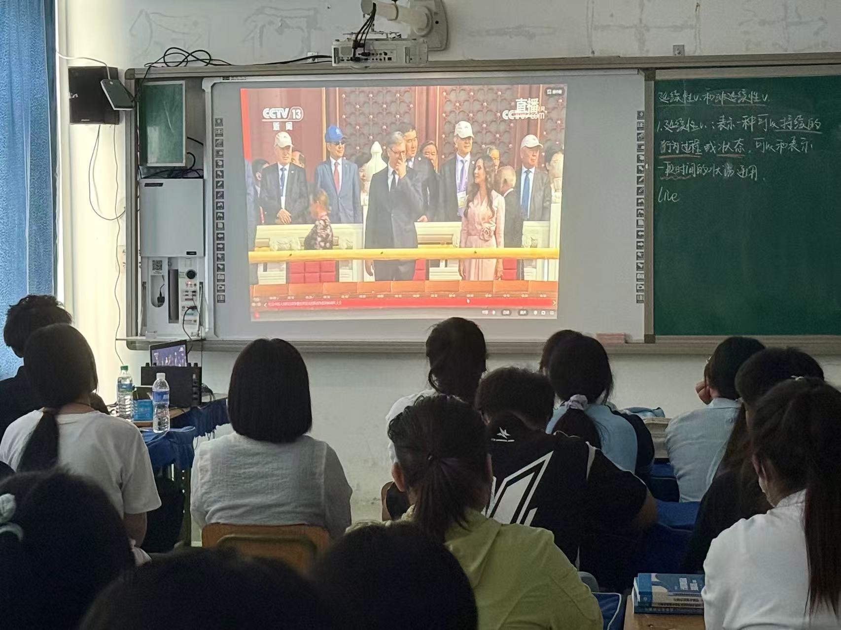 各班级教室内,师生同屏共振,氛围庄重。目光炯炯追随屏幕,凝神屏息聆听解说,专注记录阅兵亮点。