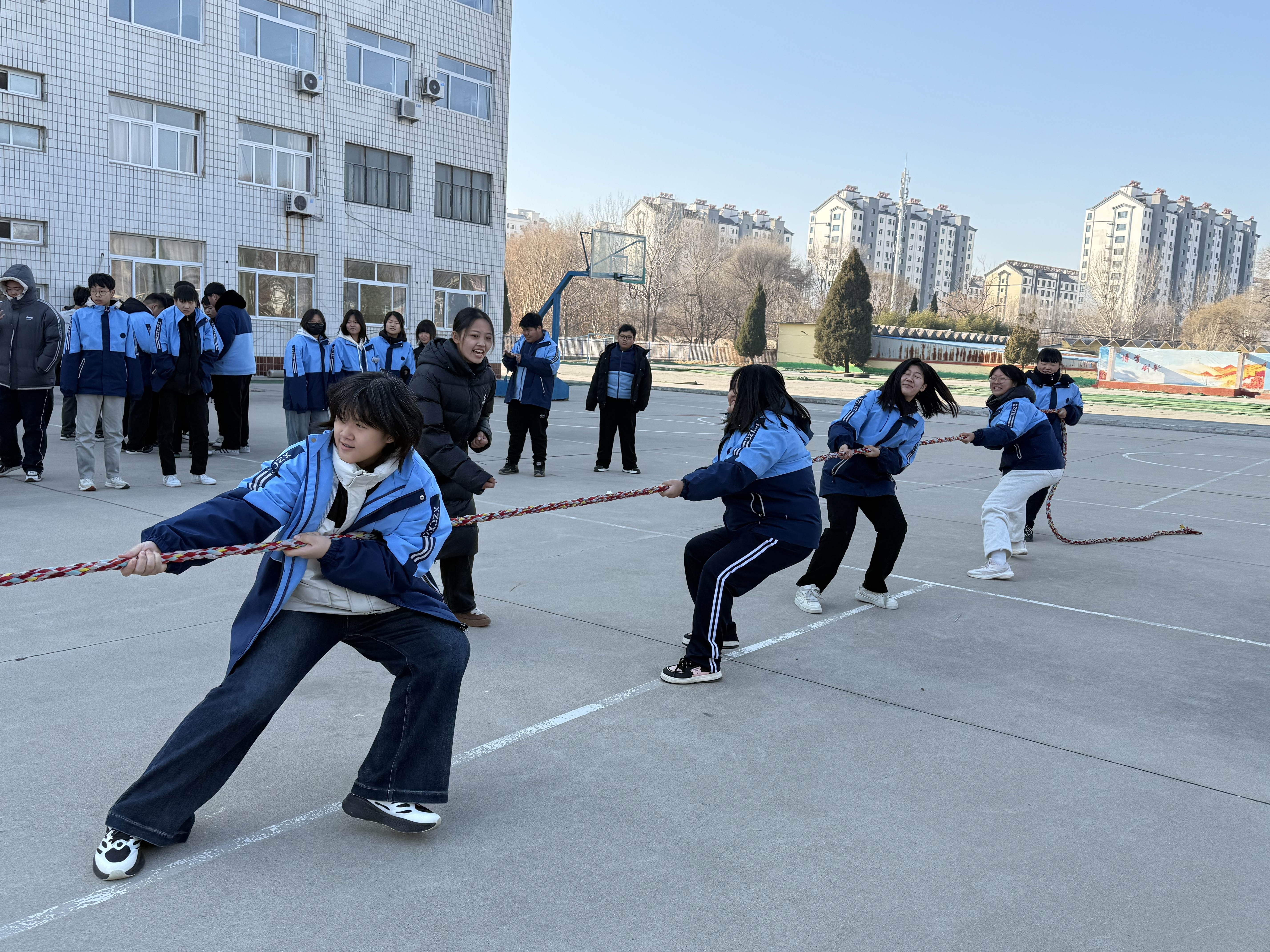 女生队巾帼不让须眉,身体后倾,脚步稳稳扎根地面,齐心协力往后拉,一张张涨红的脸庞上写满坚毅与执着,每一次发力都凝聚着团队的力量。场外,各呐喊声、助威声、欢呼声此起彼伏,响彻校园,成为赛场上最动人的背景音。大家为了自己的班级拼尽全力,将集体协作的力量发挥得淋漓尽致。
