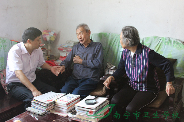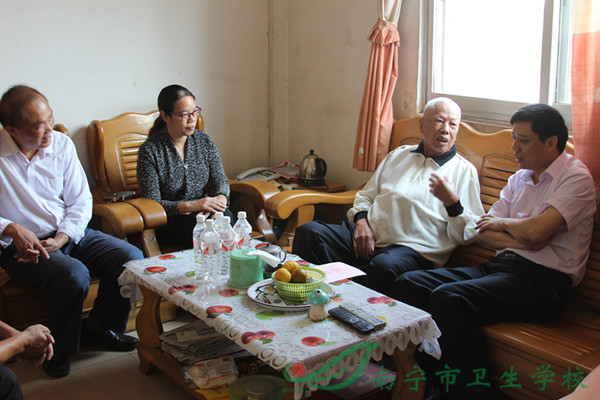 刘晓军校长(左一)与离休老干部杨凤君老同志亲切交谈,询问身体健康情况